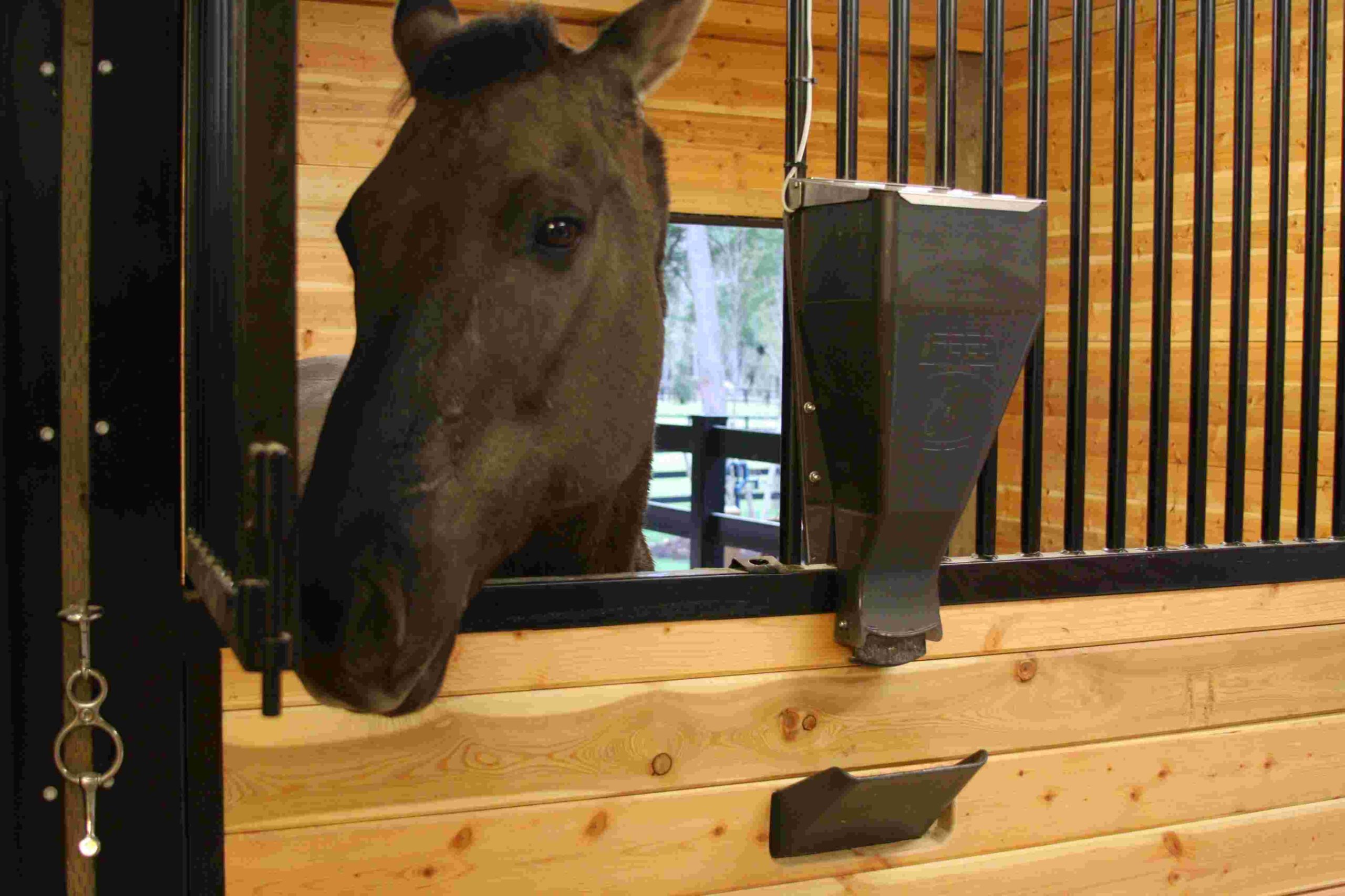 Automatický dávkovač iFEED pro montáž zvenku stáje (mimo dosah koní). Bezpečné řešení mimo dosah koní, dávkuje suché krmivo až 28× denně s individuálním nastavením.